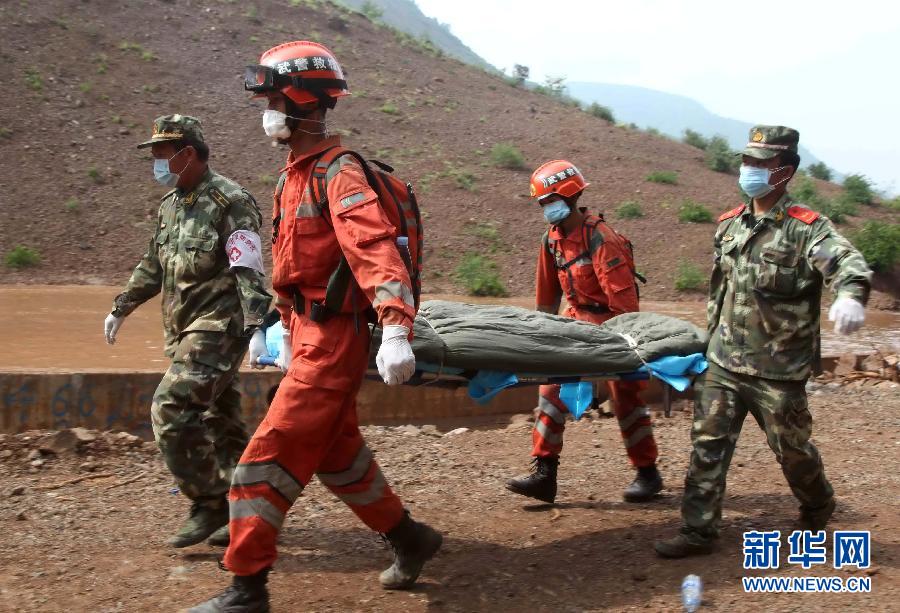 8月8日,救援人员将谢樵的遗体打捞上岸后准备送回龙头山镇。经过昼夜搜寻,8月4日在龙头山镇光明村附近堰塞湖因抢险救灾失踪的武警云南边防总队战士谢樵遗体8日9时45分在在湖面被发现并已打捞上岸。谢樵的遗体被战友们护送返回龙头山镇部队驻地。武警云南边防总队在灾区驻地为谢樵举行了简单而庄重的战地告别仪式。 新华社发(李善明摄)