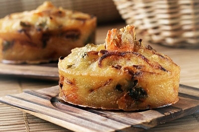 8. 再加2大匙面糊盖在萝卜丝上,上面摆放1-2只河虾后入油锅;
