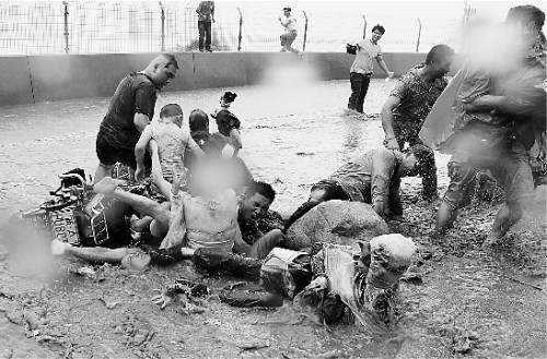 昨天下午4点多,本报摄影记者吴煌和朱卫国两人满身泥水地回到报社,朱卫国的左腿踝关节处还负了伤,拉了一道长达10多厘米的血口。