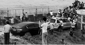 其中,有些车主停车观潮,不料浪打过来,车子熄火抛锚。这下想走也走不了,只能等待救援。
