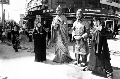 昨天上午10时许,在白广路北口菜市口百货门口,出现了两个近两米的一男一女兵马俑,4人穿着古代的服装,装扮成“秦始皇”和大臣、妃子模样,向市民散发传单,声称用该礼券能买到某音乐剧的优惠门票。这些奇特的兵马俑和古装人,引来不少市民围观,甚至有人争相与其拍照,导致路口出现拥堵。