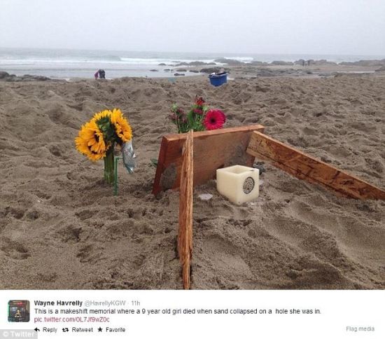 林肯市警方指出,8月29日下午,9岁女童法兰克斯随父母到濒临太平洋的海滩游玩,与其它孩童合力在岸边挖了一个深达180厘米的大型沙坑。