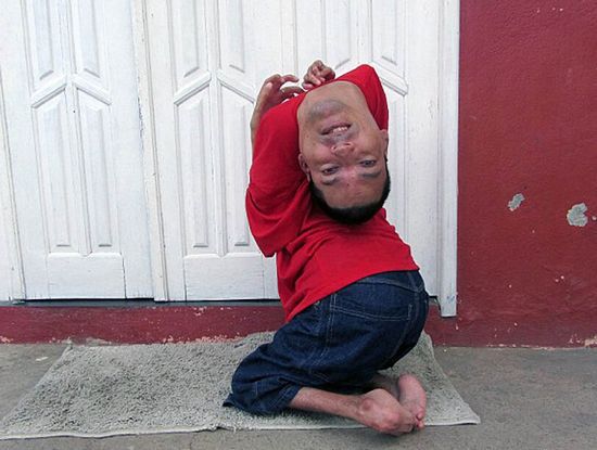 头颈颠倒:男子头颈颠倒让人惊 脖子向后折下据外媒9月1日报道,37岁的巴西男子克劳迪奥-维埃拉-奥利维拉有着不同于常人的外貌。他的脖子向后背折下,头部几乎紧贴着后背,头颈上下颠倒。