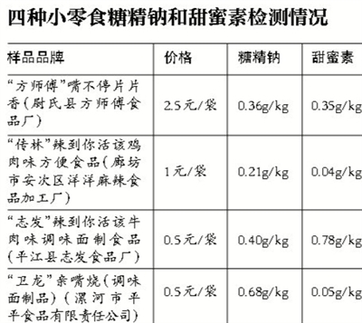 实验结果:4种小零食的糖精钠,都属于超标。而且,“传林”和“志发”这两种食品添加了糖精钠,还没有标注。