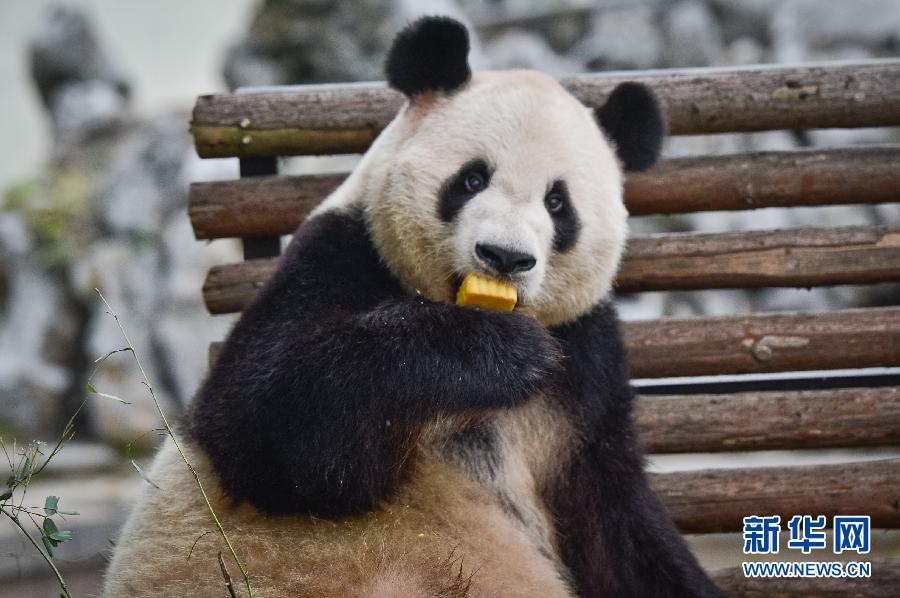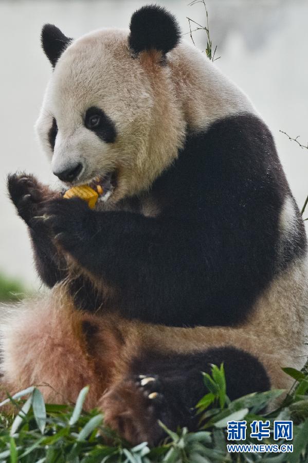 9月8日,安徽省合肥市野生动物园的大熊猫亮亮在享用“月饼”。当日是中秋节,安徽省合肥市野生动物园的工作人员针对不同动物的食性和口味,“私人订制”美味又营养的“月饼”供动物享用。 新华社记者 张端摄