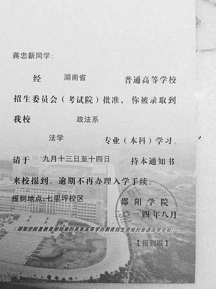 蒋忠新,新邵二中279班的一名高考(微博)生,即将成为邵阳学院法律系的一名大一新生,也是2014级湖南省年纪最大的大学新生。