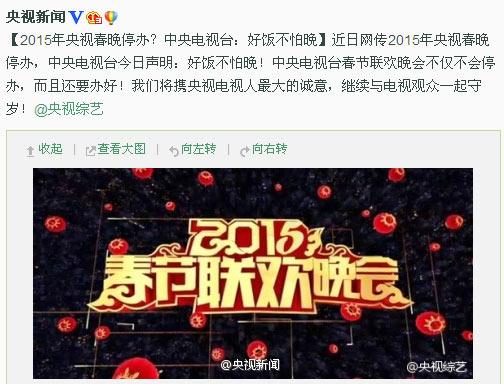 据央视新闻微博,近日网传2015年央视春晚停办,中央电视台今日声明:好饭不怕晚!中央电视台春节联欢晚会不仅不会停办,而且还要办好。我们将携央视电视人最大的诚意,继续与电视观众一起守岁。
