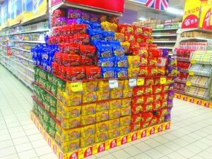 昨日本报记者走访广州越秀区某超市发现,电梯一侧“黄金”产品位置堆放着康师傅数款五连包产品,其中部分有特价;在方便面专区,康师傅与统一都有十几款产品在售,相同口味的产品也价差无几。该卖场的康师傅系列似乎并没有送肠产品,而统一来一桶红烧牛肉面则标注“还送火腿肠”,该105克来一桶红烧牛肉面售价为4.2元,康师傅144克超大桶红烧牛肉面售价为4元。