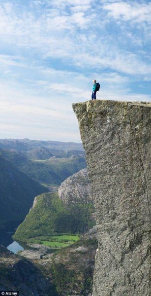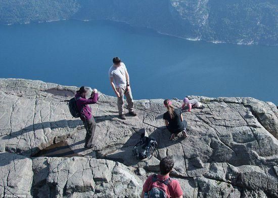 13日下午,在挪威南部一个高604米的悬崖上,一名婴儿被家长放在危险的悬崖边照相,很是吓人。