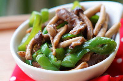 辅料:油适量 盐适量 豆豉适量 生抽适量 料酒适量 步骤 1.准备并洗净食材; 2.青椒切条,新鲜茶树菇从中切成2段; 3.猪肉切成段状,加生抽及少许食盐、料酒腌制; 4.热油锅快速炒熟猪肉; 5.炒熟后盛出; 6.利用锅中余油爆香豆豉,放入青椒; 7.马上放入茶树菇; 8.炒至茶树菇、青椒断生,放已炒好的猪肉; 9.翻炒均匀即可。