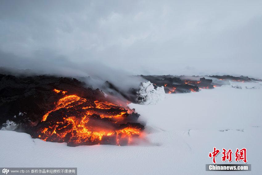 当地时间2014年9月26日,冰岛巴达本加(Bardarbunga)火山熔浆喷发。图片来源:CFP视觉中国