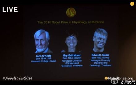 @果壳网#诺贝尔奖#生理学或医学奖授予约翰·奥基夫,迈-布里特·莫泽 (女)和丈夫爱德华,以表彰他们发现了大脑中负责定位系统的细胞。