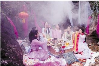 一处幽静的山谷,6名身着古装的年轻貌美女子盘膝而坐。烟雾袅绕中,女孩们拱手为礼,兰花指微翘,杯中红酒一饮而尽。一阵微风拂过,身旁帷幔翩翩舞动,恰似仙境一般。