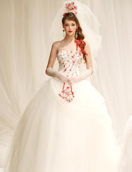自从在快本上高调公布恋情之后,佟丽娅和陈思成这对CP曾数度传出婚讯,而在2014年年初时,2008就已经相识的两人也终于在大溪地举行了一个特别的“疯爱婚礼”。而佟丽娅的结婚礼服至少有两套,都来自Georges Hobeika2014婚纱系列。一套是出嫁和拍婚纱照时有肩带的古典胸衣撑裙式婚纱,上衣的胸衣造型和细密缝合线清晰可见,发型是披发;一套是办仪式时的抹胸撑裙婚纱,发型是盘发于顶。两条婚纱的裙子部分比较相似,都是撑裙造型和花朵装饰,与品牌发布的照片不同的是,佟丽娅的婚纱多出了肩带,想来也是为了不在结婚典礼上来个尴尬的走光吧。