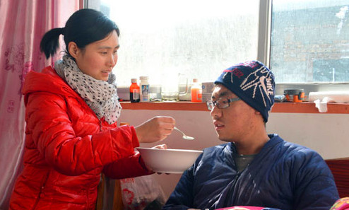 “她怀孕8个半月的时候,还挺着个大肚子在医院照顾丈夫。”蒙阴县中医院的医生告诉记者,为了给儿子挣医药费,陈洪波的父母都外出打工,照顾陈洪波的重担便落在公凤丽一人身上。有一次陈洪波发烧,公凤丽去接水给他擦身子、洗脚,水龙头矮,挺着大肚子的公凤丽弯不下腰,只能一条腿跪在地上接水,这一幕感动了病房里的很多人。