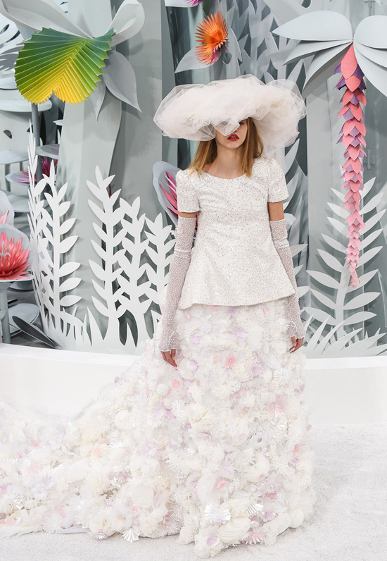 Chanel 2015秋冬高级定制的压轴婚纱就大胆选用了短袖罩衫搭配花朵美裙的样式,有些休闲随性,但又绝不失唯美。