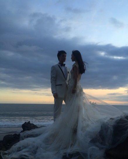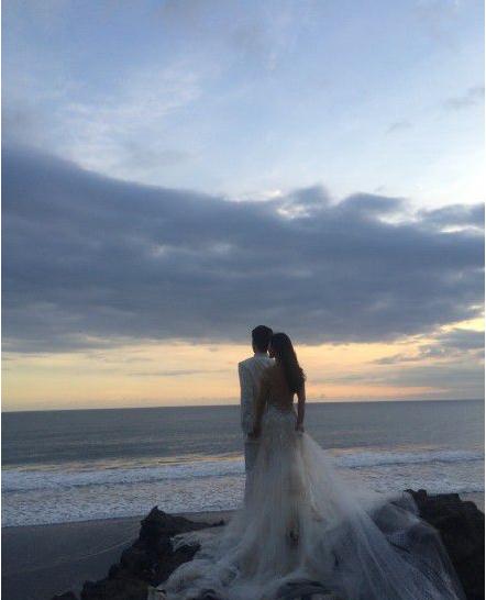 照片中,陶昕然与丈夫站在海边的礁石上深情对望,陶昕然一头长长的秀发随风飘散着,在朝霞的映衬下,二人甜蜜梦幻,幸福满满。