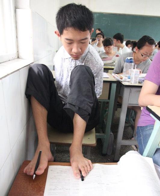 彭超,6岁时因触电失去双臂,然而,苦难并没有击垮这个孩子,他学会了用脚穿衣、写字、上网……本月初,他参加高考,虽然他获得45分钟的语文延时,但他是用脚答卷,成绩发布,他得了603分!超过一本线!