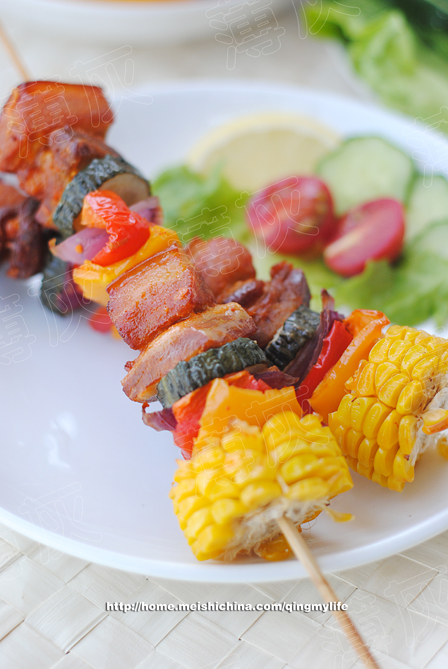 7、再将红黄彩椒、洋葱、黄瓜、玉米与略烤的五花肉串称肉串。