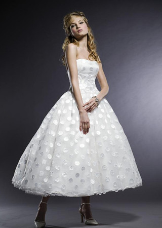 可爱的小新娘可以选择短款婚纱,有别于传统长婚纱的呆板,短款婚纱更显活泼俏丽。如果你是活泼开朗的娇小MM,短款婚纱将是你最佳的选择。