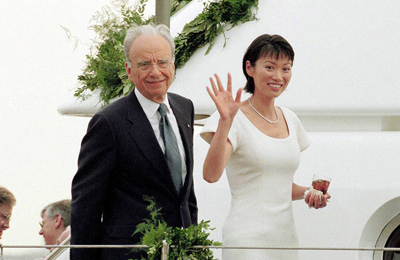 但是,默多克长期以来一直钟情于有着巨大潜力的中国市场,邓文迪凭借流畅的中英双语交流能力和迷人的社交风采已在新闻集团上下给其带来了“默多克形象大使”和“亚洲外交官”的美誉,她渐渐从幕后走到台前,开始进入公众视野。图为2001年,默多克携妻子邓文迪在太阳谷参加一个商务会议。