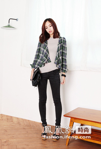 格纹造型的开襟衫同样是无扣设计,穿起来舒适潇洒,OL也很适合的搭配,无论混搭窄脚裤还是收身裙都能给人很个性的感觉。