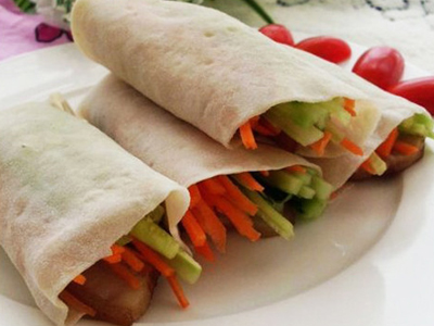 8、将冷藏好的将五花肉取出,切成薄片;黄瓜洗净,切丝;胡萝卜洗净切丝。取一张蒸好的荷叶饼,刷一层甜面酱,码上五花肉、葱丝、黄瓜丝和胡萝卜丝,卷成卷状,自制的卷饼就做好了。