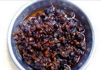 八宝豆鼓是山东临沂的名特产品之一,是以大黑豆、杏仁、茄子、鲜花椒、紫苏叶、鲜姜、芝麻油、白酒八种原料,经过一年天然密闭发酵而成。