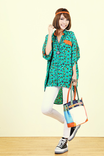 抢眼的彩色豹纹衬衫,绿色款就恨个性,宽松的款式显得大气时尚,垂坠感很好,搭配窄脚裤或打底裤同样能让你这身装扮很精彩。