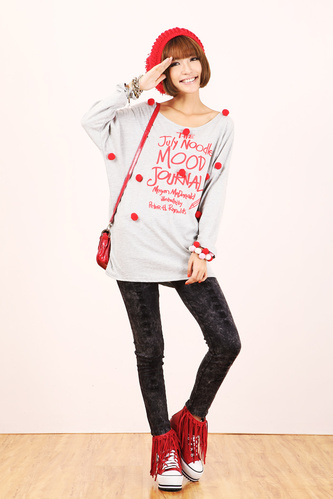 可爱的球球装饰很讨喜,整体造型很俏皮的学生样看起来也很年轻,可以在鞋子的选择上花些功夫,这里搭配上一款红色流苏帆布鞋就相当个性,你也来试一试吧!