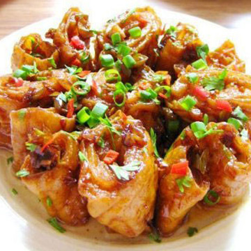 猪大肠、葱、姜、蒜、盐、醋、鸡精、绍酒、生抽、老抽、清汤、白糖、胡椒粉、肉桂粉、砂仁粉、香菜、植物油、花椒油等适量
