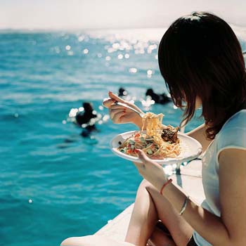 蔬菜、鲜果、生鱼片并没有什么,热量的源头自然是大勺的沙拉酱、乳酪丝、蜜饯坚果。堂而皇之地让食物更加秀色可餐,也让你吃进的热量和脂肪节节攀升。如果是面食沙拉,热量很可能超过一份传统意面。