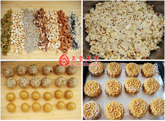 2、五仁,可以根据自己喜欢,选择不同的果仁,如果是生的,要提前用干锅小火炒熟,或用烤箱,150度烤熟,时间不等,要注意观察,取出放在手指间搓一下,皮能搓掉即烤熟了。