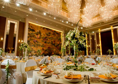 婚宴不论规模大小,分区模式都是相同的,一般分为迎宾区、舞台和宾客席三个部分。对于客人不多,且以家人为主的迷你婚宴,布置重点应集中在舞台和餐桌上,不必浪费太多的金钱、精力去打造迎宾区。可以选择圆形舞台或T型台代替传统的前置舞台,这样便可与在场宾客更好的沟通与交流。