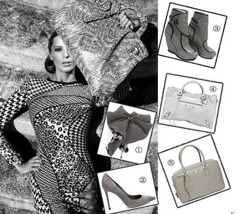 2011年最流行的颜色?!除了经典的黑白之色,时尚的你绝对不容忽视的还有灰色。这是一种看上去最为舒适的颜色,并以其百搭性独占鳌头。这个秋冬,赶紧为你的衣橱添置几件灰色单品,实用、百搭、最具投资价值。 ①COMPLEX BIZ 珂梦莱简约格子日系风爪夹 ②Gianvito Rossi2011新款简约灰色尖头细高跟鞋 ③BALENCIAGA 巴黎世家2011秋冬新款灰色翻折饰扣拼接楔跟及踝靴 ④BALENCIAGA 巴黎世家2011秋冬新款CITY系列浅灰色手提单肩包 ⑤Prada 普拉达2011秋冬新款SAFFIANO灰色牛皮手拎包