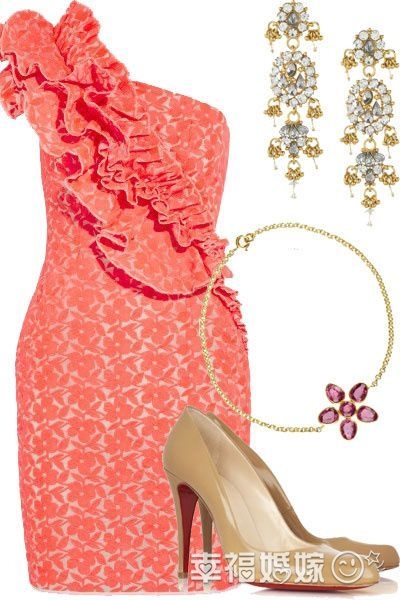 缎面的明黄色高腰抹胸小礼服,搭配珍珠长流苏耳坠,让伴娘摇曳生姿。