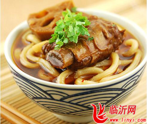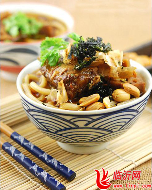 12.骨汤+水烧开,放入乌冬面煮熟,也可以使用普通切面。码放上排骨,可以根据喜好添加配料,如麻辣花生、木鱼花、烤紫菜等,一碗丰富的骨汤面就做好啦。