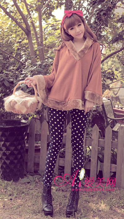 驼色依然是这个秋冬的大热流行色,人工皮草滚边增添温暖与可爱感,搭配波点legging上宽下窄让腿部看起来更加纤细,鲜红色蝴蝶结发饰倍增可爱气息。