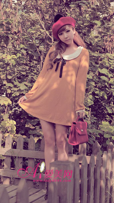 驼色连衣裙,圆领 + 蝴蝶领结增添甜美气息,搭配红色贝雷帽,乖乖女形象瞬间打造。