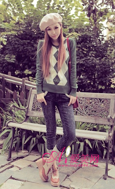 菱格纹针织衫优雅时尚,搭配雪花紧身牛仔裤,毛绒翻边增添俏皮感,搭配一双厚底牛津皮鞋,潮味十足。