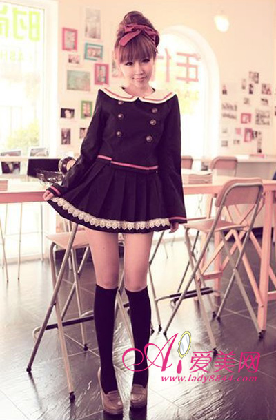 学院风双排扣设计连衣裙,超短的剪裁展现迷人修长的美腿,搭配一双黑色长筒袜让小腿看起来更加纤细。