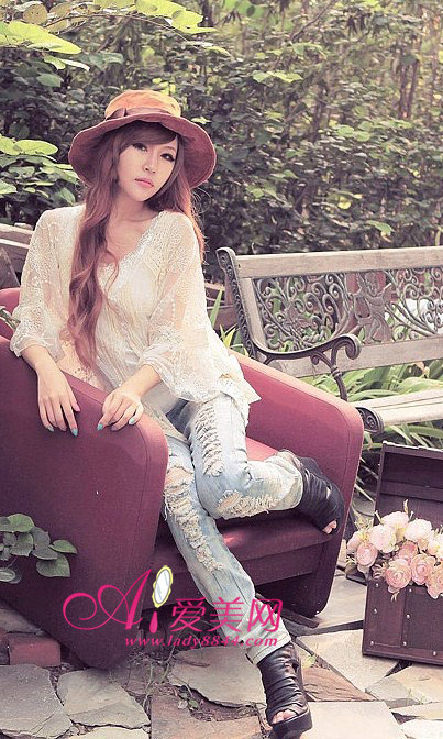 带一点点透视效果的蕾丝雪纺衫,性感迷人,搭配破洞牛仔裤,加上宽檐帽以及鱼嘴高跟鞋的点缀,妩媚而极具个性。