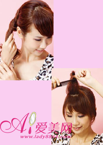 先把长发都往后梳,喷上定型产品以后往侧面拧卷,然后打结固定。利用马尾的一束卷发做成小花苞头再固定好就可以了。取出一层刘海用梳子刮蓬,改善扁塌的造型。