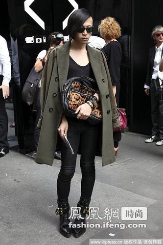 韩火火做潮人范儿就要玩儿的正,韩火火紧跟当下复古军旅风也不忘秀下小个性,豹纹皮包相当抢眼,仅作配饰出现算是很出色的搭配了,复古感觉的深橄榄绿大衣休闲帅气的感觉不言而喻,皮靴也是亮点之一,稍逊色于皮包的吸睛度,但也给整体增添了不少看头。