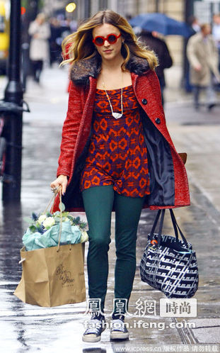 菲妮·科顿 (Fearne Cotton) 厚厚的翻毛领一下子就能吸引住路人的目光,光看上去就很有质感,相当精细考究的做工让形象上升了一个档次,内搭也十分出色,抹胸吊带万花筒般的花纹让形象充满立体感,配上墨绿色休闲裤这样的撞色搭配一定能给人留下很深的印象。