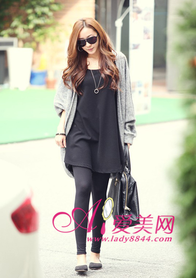 黑色的长款T恤搭配红色打底裤,韩式的搭配法层次很重要,加上一件蝙蝠袖的灰色针织外套,帅气更有型!