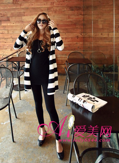同样是黑色的内搭已经超显瘦了,就算搭配上你惧怕的条纹外套也一样是会有显瘦效果!