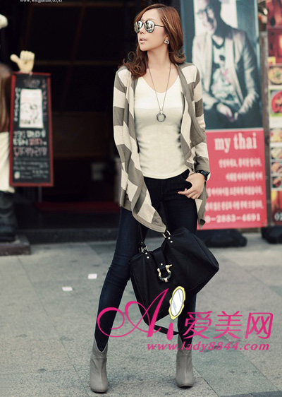 如果你的腿部还算纤细,露腿是显瘦重要一步。短裙或是短裤加上丝袜与长靴的穿法你一定要学会,搭配上长款的黑色针织外套想不瘦都难!