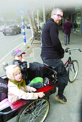 “我们是为了送女儿上学才买的三轮车和自行车,花了370块钱”,他们就住在新街口,离孩子所在的南大幼儿园不远,觉得骑车很方便。“每天早上也就20分钟吧!骑三轮车很酷啊,不仅方便而且还能锻炼身体,孩子们也很乐意坐在里面。”提到路人的“注目礼”,他的妻子马上用夸张的动作加上眼神,模仿行人们看到一个老外骑三轮的惊讶神情,“他们往往正走路,猛然发现我们,都走过去了还是会急剧扭头,"哇"地表示各种吃惊。”