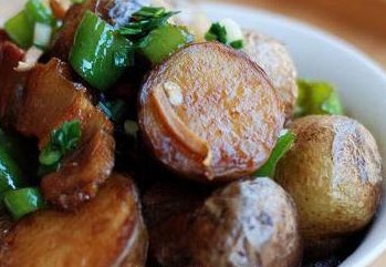 4、炒锅烧热,放油,将土豆放入,用中火煎到表皮焦黄发皱,盛起;